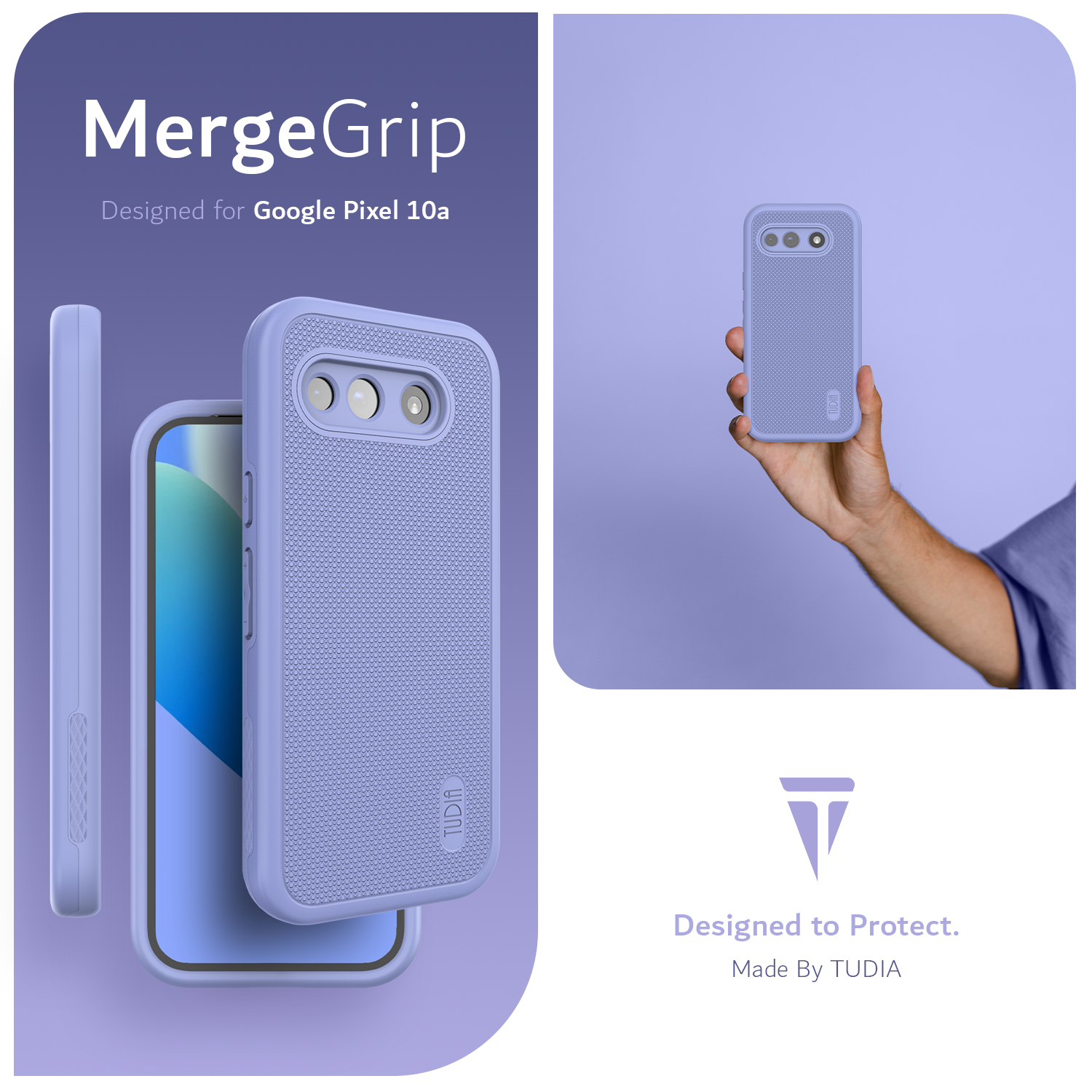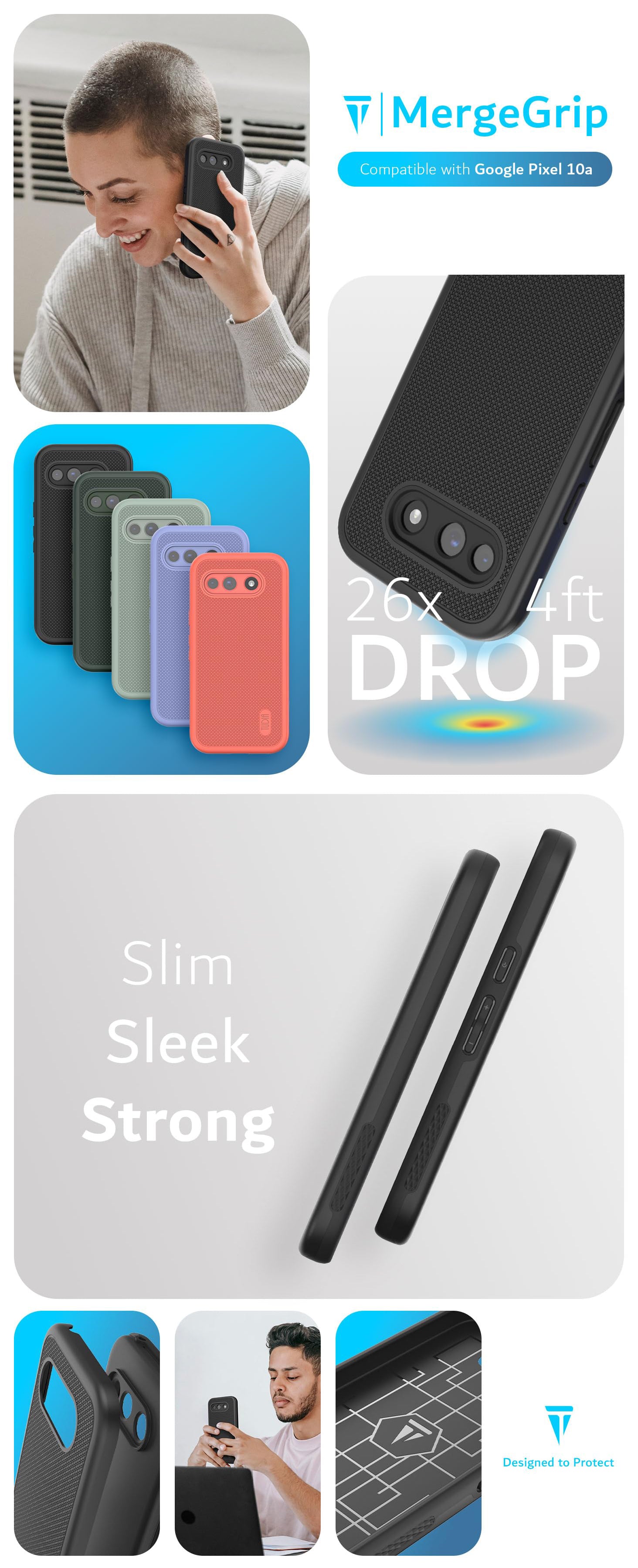 The MergeGrip design features an enhanced non-slip texture on the sides and back, giving you a secure and confident hold throughout the day. Raised edges around the screen and camera provide added protection against scratches and surface contact, while precise cutouts and responsive buttons ensure seamless access to all functions. It’s the ideal case for keeping your Pixel 10a safe without sacrificing style or usability.