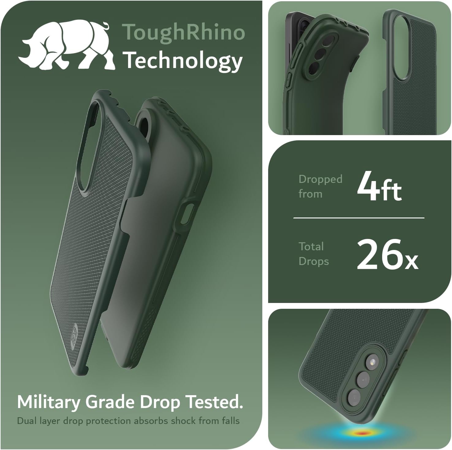 ● Drop Tested: Military-grade ToughRhino dual-layer protection against drops, impacts, and scratches.