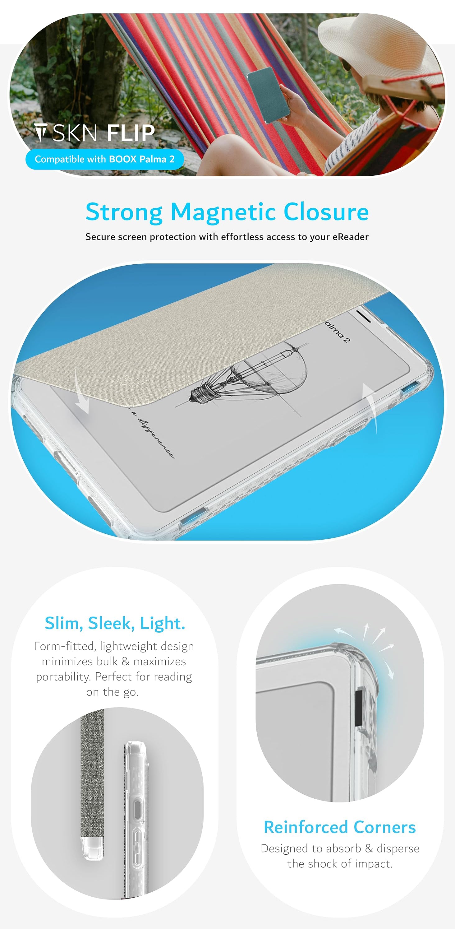 Built with enhanced auto wake/sleep technology, the case instantly wakes your device when opened and puts it to sleep when closed—saving battery life without interrupting your reading flow. Its slim, lightweight design adds minimal bulk, making it perfect for travel or daily use. With precise cutouts and a snug fit, the SKN FLIP V2 offers full protection without compromising accessibility or comfort.