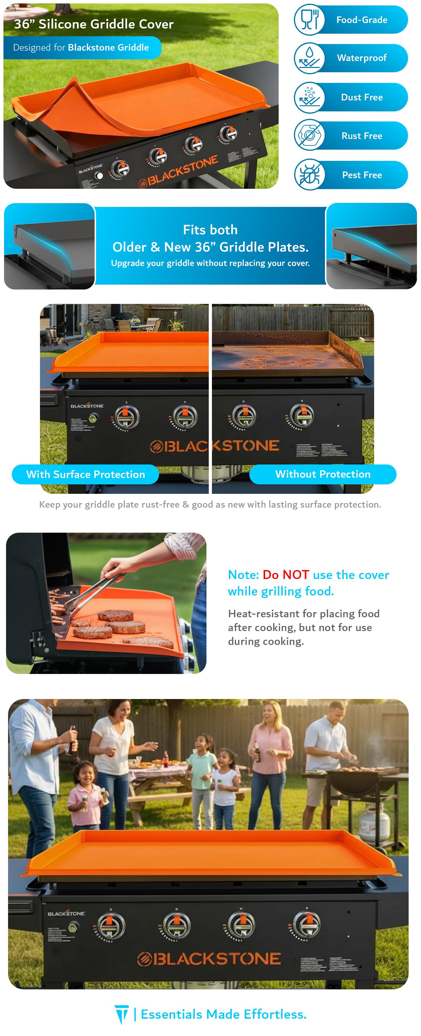 Engineered for a precise fit on both old and new Blackstone 36" designs, it’s lightweight, flexible, and easy to handle with raised edges and a built-in grip. The dustproof and splashproof design helps prevent corrosion and surface damage, while the non-toxic material ensures safe use around food. Plus, it’s easy to wash, quick to store, and tough enough for daily outdoor use. Keep your griddle in top shape with the TUDIA 36" Silicone Griddle Cover — your best choice for long-lasting, all-weather protection.